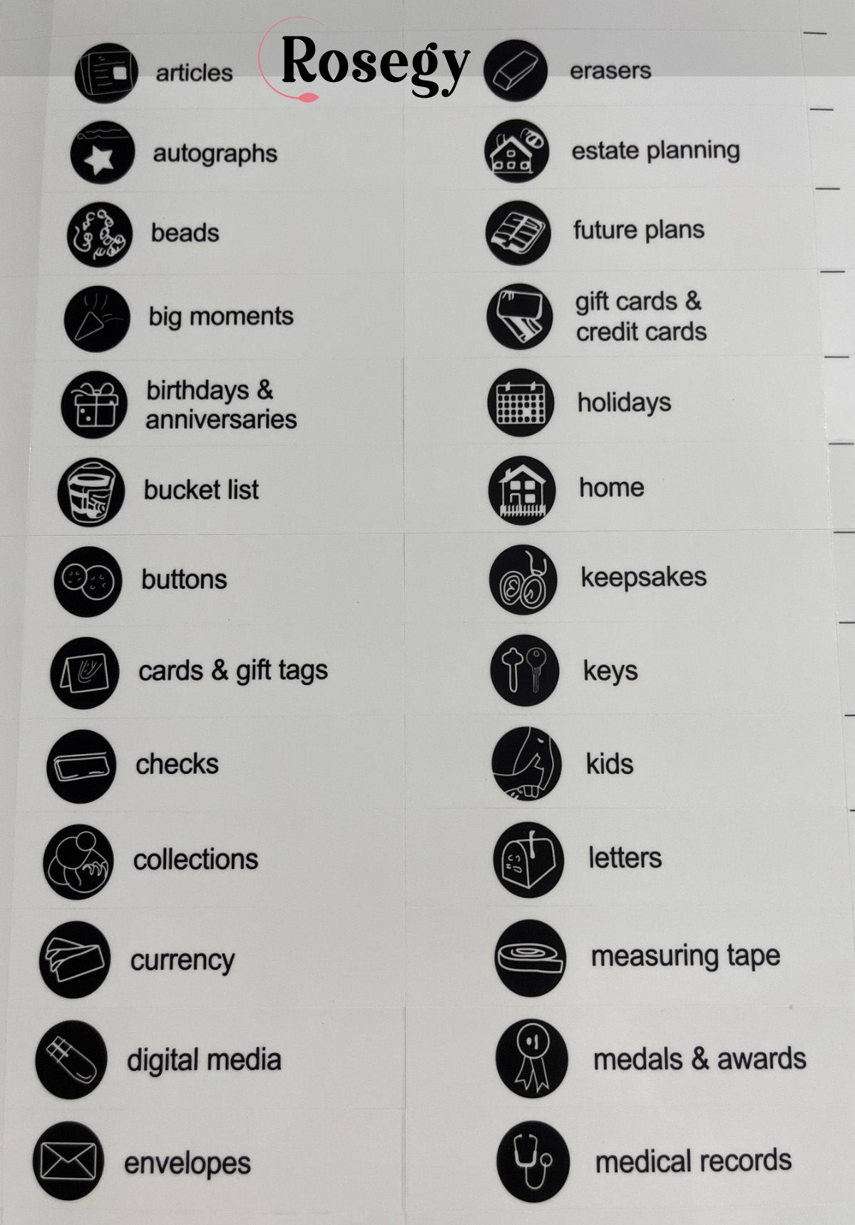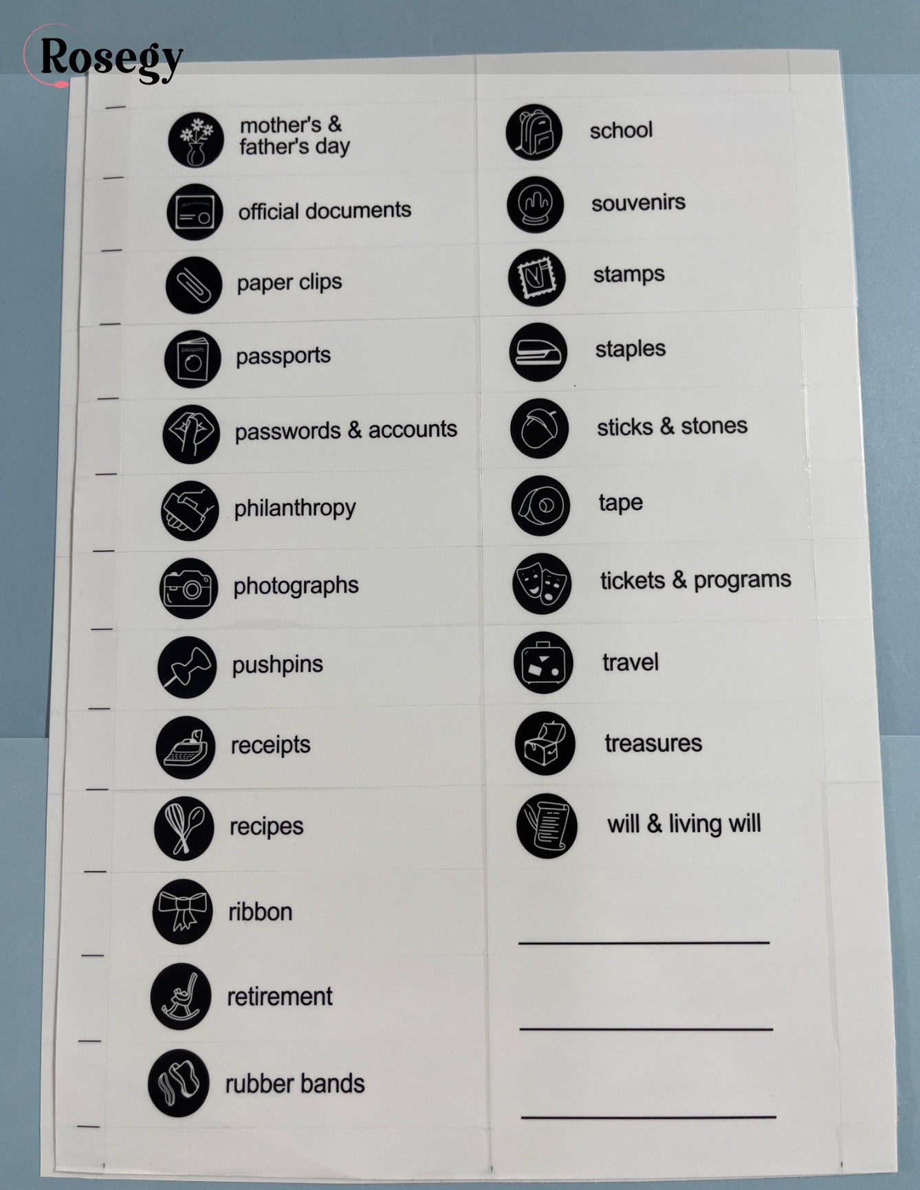 A hand-illustrated table of contents helps you keep track of your documents with style. Plus, the sticky labels provides a convenient tracker for incoming documents that need to be named.